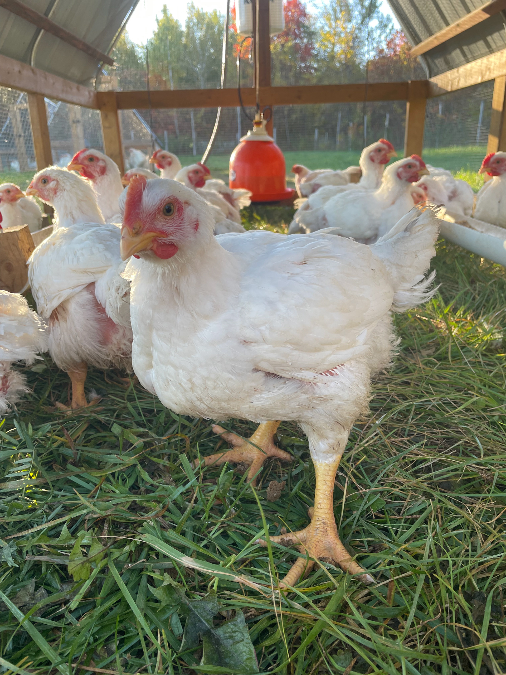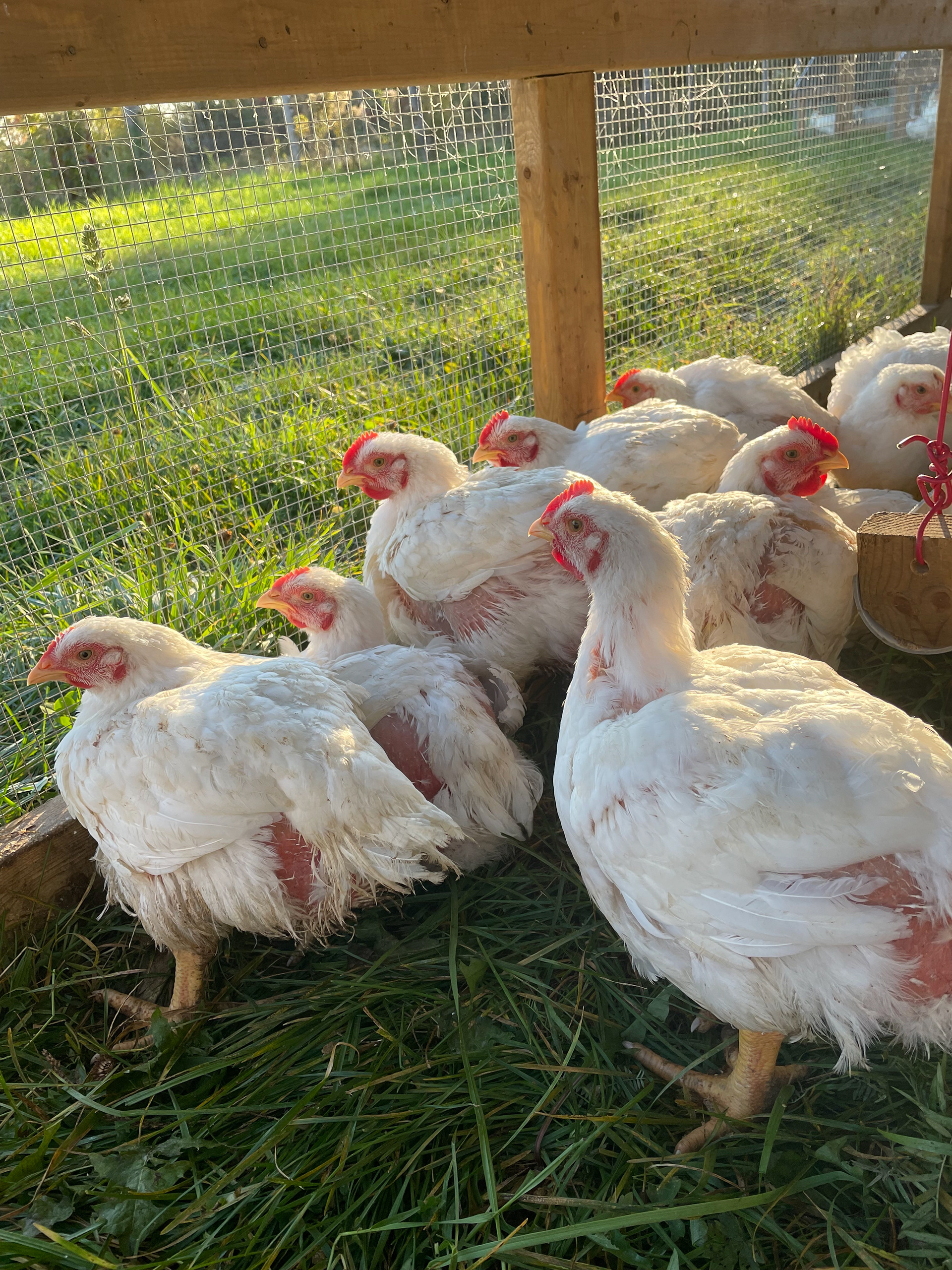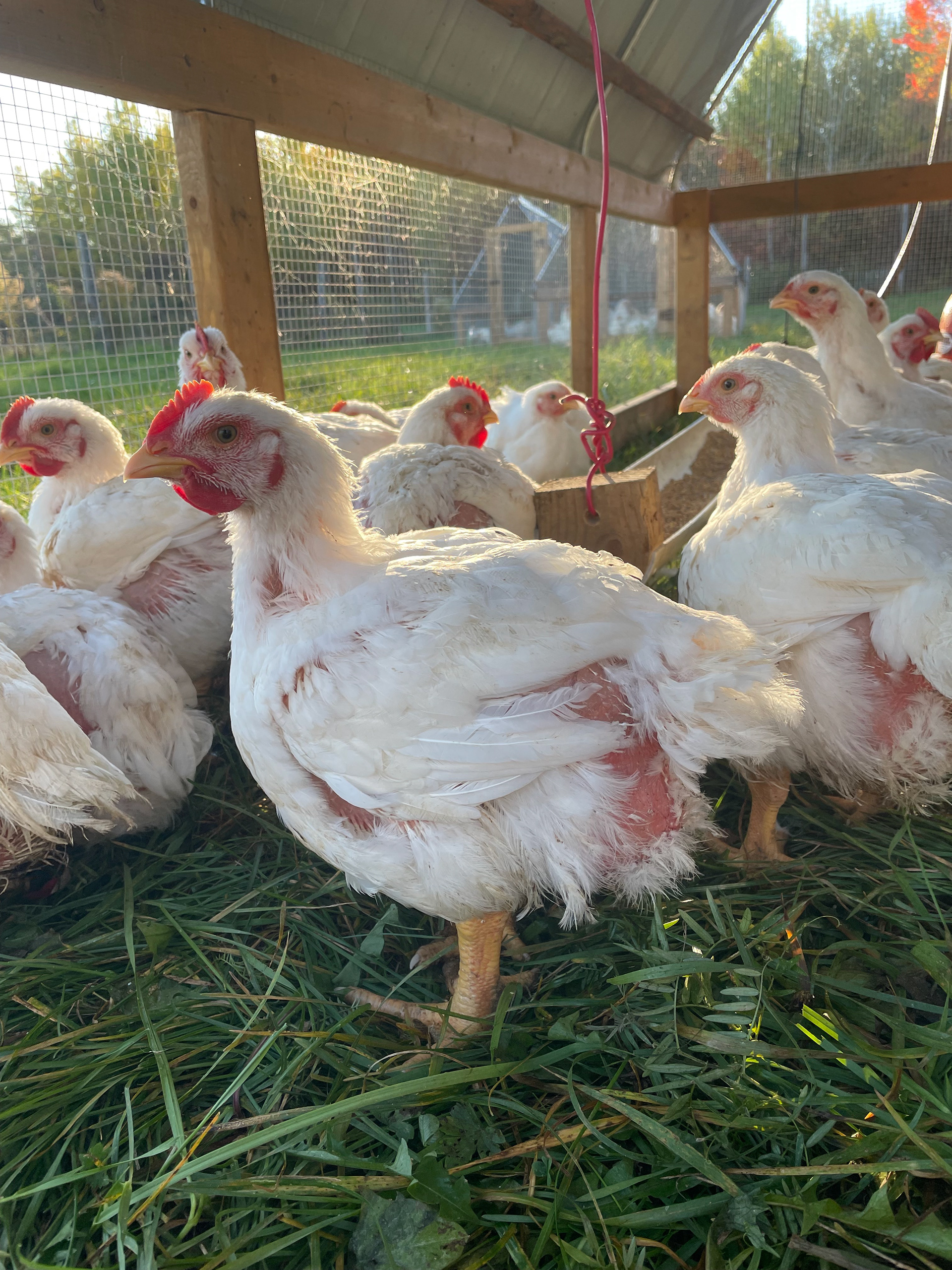 Tous nos poulets sont élevés en pâturage dans des poulaillers mobiles. Chaque jour, les poulaillers sont déplacés afin de leur fournir un nouvel espace, tout en évitant la surcharge du sol. Ce changement d’emplacement offre une alimentation plus variée aux poulets, protège la terre, limite les parasites et fertilise naturellement le sol.